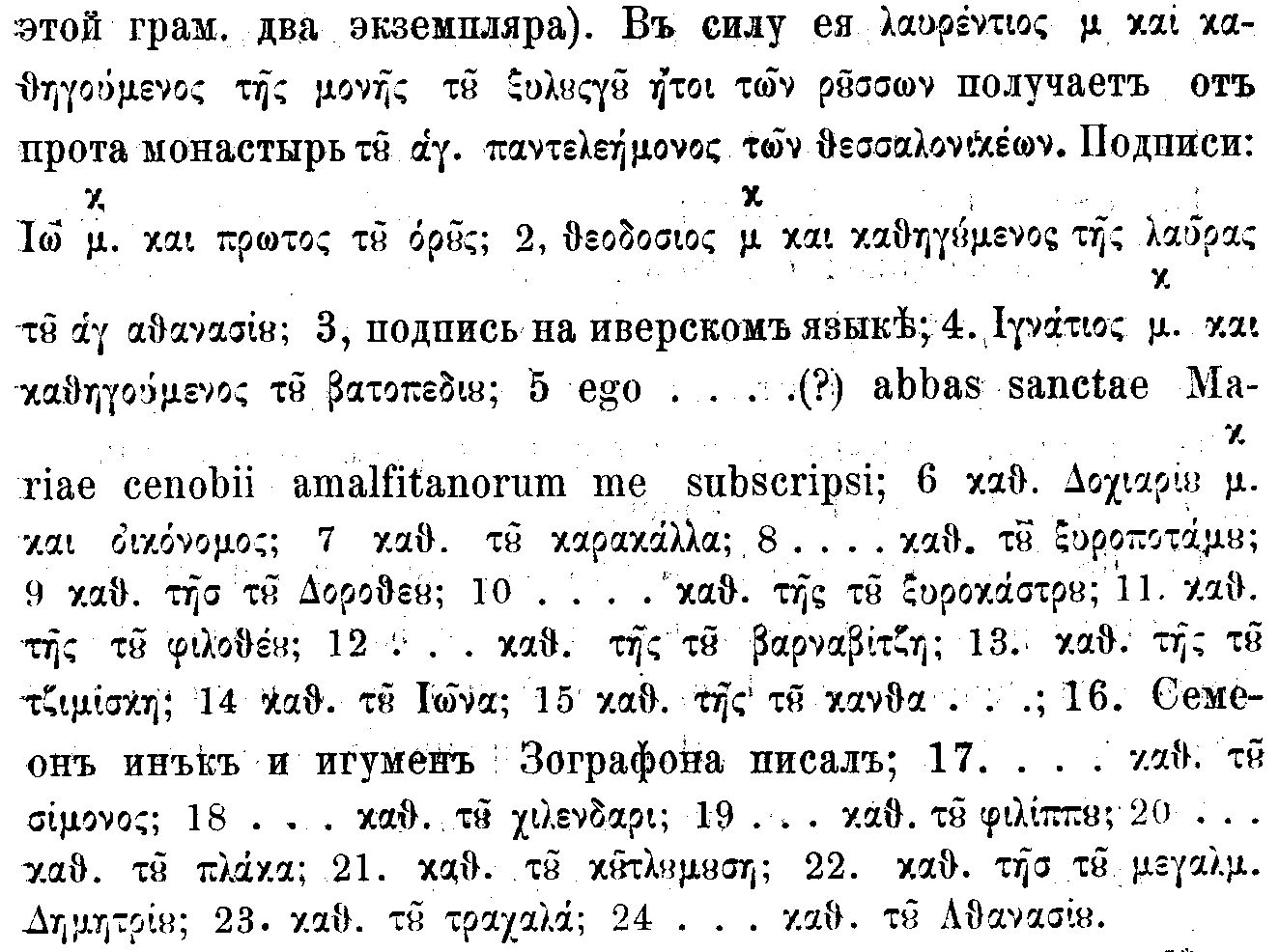 24. 6871 (1363) подписи: смиренный прот св. горы афонские монах Дорофей (по словянски) и 10-и игуменов (по гречески). О том, что разоренный турками м. Katzarh приобщается монастырю св. великомученика Пантелеимона Русских (serasmia monh twn Rwsswn). Грам. греческая.