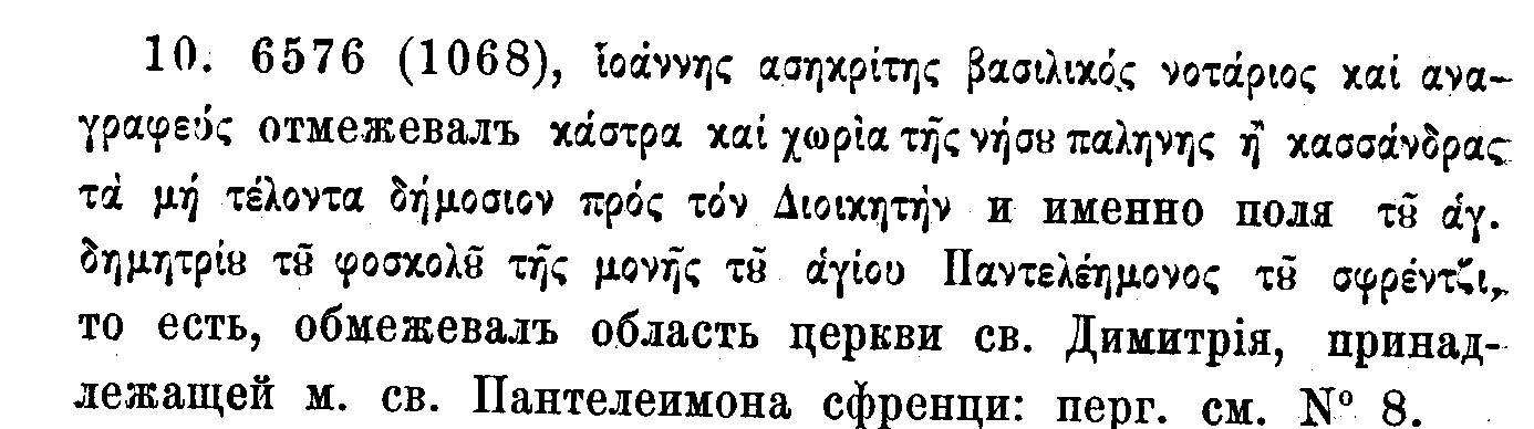 7. 6576 (1068) без подписи. Свидетельство о межах между областию монастыря tou kur leontoV tou sjrentzi и селениями болгар (ginuskunteV akribuV ta suropa twn bolgarinwn), на полуострове Кассандра. Четвертка пергамен.