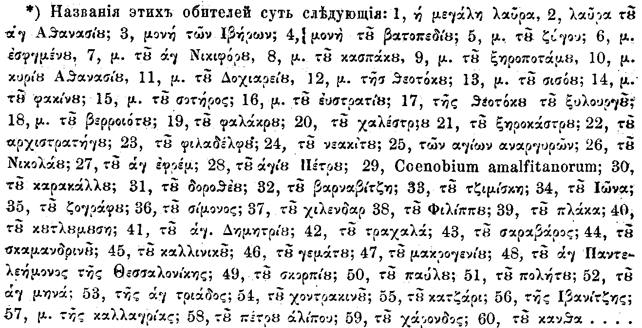 По актам, мне известным, еще в XII веке на святой горе было 60 обителей и в том числе латинская, Coenobium Amalfitanorum 11. Основываясь на этих актах, ложно вообще определить время, когда уже существовали настоящие монастыри. Великая лавра, бывшая в Карей, основана Иоанном Цимискием, ее соборная церковь сооружена Импер. Михаилом, сыном Феофила. Лавра св. Афанасия получила начало в X столетии, именно около 970 года. Немного позже основаны Ватопед, Ивер и Эсфигемену. В хрисовулах XI столетия упоминаются Дохиар, мон. пресв. Богородицы, что ныне, кажется, Филофеу, м. Павлу и м. Ксиропотам. В хрисовулах ХП стол. находятся подписи игуменов мм. Каракаллу, Зогафу, Симона и Петра, отдельных обителей, Хилендара и Кутлумуша. Этот последний вместе с Дюнисиу и Кастамониту основан Императорами дома Компинов. Название Кастамониту напоминает более о Кастамони, родном городе Комнинов, чем об Императоре Константии. Монастырь Руссико уже в XII столетии почитался одним из главных. [77] Монастыри Григориу, Ставроникита, Цандократор 12 и Ксенофу существовали прежде под другими названиями. — Все эти монастыри возникли из соединенных "игуменаров." Так напр. м. Руссико образовался из соединения обители пресв. Богородицы называемой Ксилургу или русских и обители св. Пантелеймона, солунского.