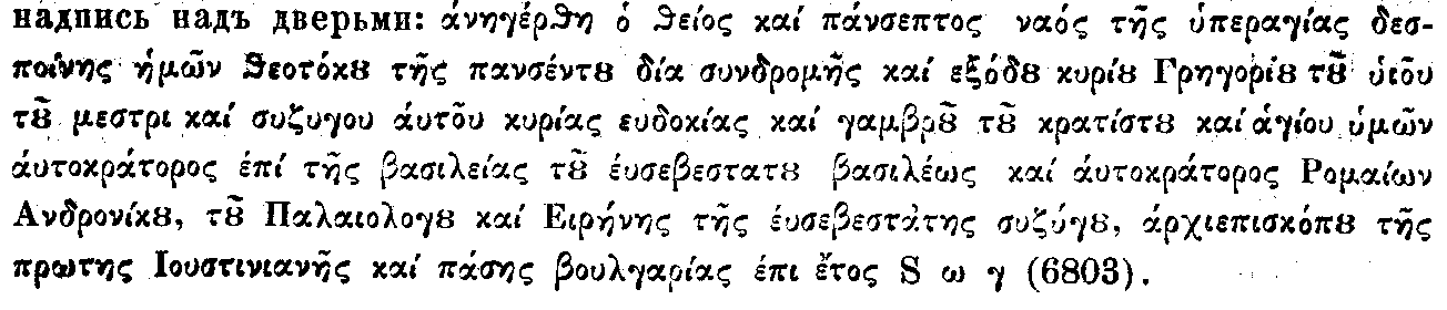 т. е. Григория.... сень (храм) воздвигнув.... божественным законам народы мисов (олгаров) поучает премудро 6520 (или 6820?). Этот храм обращен был в мечеть, которая теперь, по ветхости здания, редко бывает посещаема турками; потому мне возможно было ближе его рассмотреть. Здание без купола, продолговато, в 100 шагов длины и 58 ширины, представляет снаружи как бы три этажа, разделенные малыми колоннами; с западной стороны башня, как бы остаток колокольни. Внутри восемь больших столбов поддерживают своды; два ряда мраморных колонн украшают хоры. С восточной стороны, справа а слева верхней части храма находятся два ниша или углубления, из которых правый заложен камнями. У жителей есть предание, что в них сохранялась ризница и книги. О последних думают, что они до сих пор там остаются.