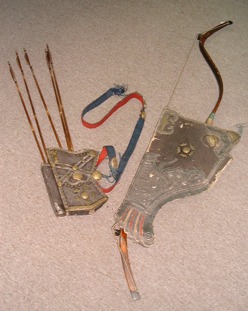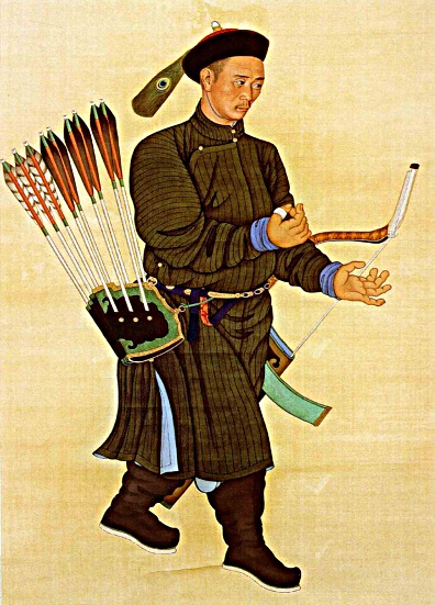 В руках Чжаньиньбао держит сложносоставной лук монгольского типа, обернутый берестой. Изображение очень детальное и позволяет увидеть характерную деталь оплетки – берестяная полоска не охватывает кибить лука полностью, оставляя узкую темную полоску вдоль всей кибити на стороне, обращенной к стрелку. Изображение хорошо согласуется с описаниями маньчжурских луков, оставленных Н.Я. Бичуриным: