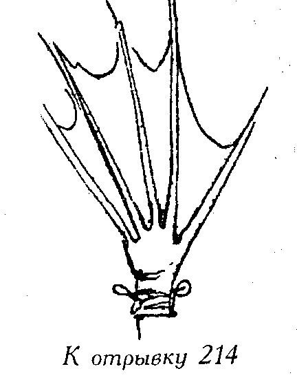- (Отдел "О летании" предваряется характерным отрывком о птице — "действующем по математическим законам инструменте" (209). При изучении законов действия этого "инструмента" Леонардо отправляется от аналогии воздуха и воды (210-211), плавания и летания (212-213). Ярок рисунок отрывка 214 — перчатка в виде птичьей лапы для плавания в море.