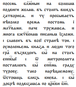 Но затем, еще больших подвигов добиваясь, поднялся он в столб и затворился, и тут пребыл какое-то время в посте и молитвах, в трудах... переложил многие божественные писания... И восславлен был он по всей той стране... мольбами князя и народа града того возведен был он на престол епископский… Митрополитом поставлен был он в епископы града Турова, в котором и подвизался. Находясь близ Киева... славно подвизался во благо божией церкви... |