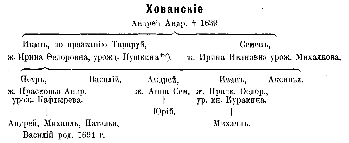 Князья Хованские происходят от Гедимина, великого князя Литовского. Внук Гедимина Патрикей Александрович, князь Звенигородский, прибыв в Москву в 1408 г., вступил на службу великого князя Василия Дмитриевича. Его сын, князь Федор, имел сына Василия, который прозывался Хованским; он то и был родоначальником князей Хованских, игравших такую видную роль в важнейших государственных делах ХVII столетия, которая и привела некоторых членов этой фамилии к глубоко-трагическому концу.