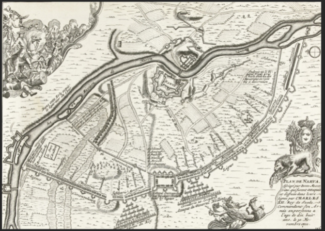 Рис. 1. План битвы под Нарвой. Гравюра неизвестного автора, отпечатанная Питером Мортье в 1702-1703 гг. в Амстердаме.