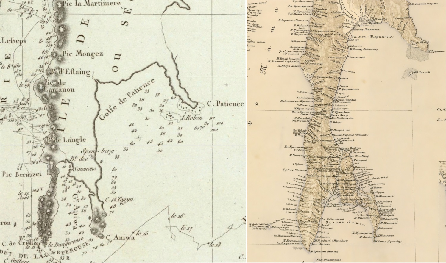 Фрагменты карт: Лаперуза «Carte des Decouvertes Faites en 1787 dans les Mers de Chine et de Tartarie par les Fregates Francaises la Bousole et l’Astrolabe…» и Никитина «Карта острова Сахалина» (1885 г.)