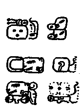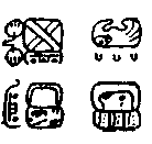 — передано тремя знаками. Первый знак обозначает долгое а, но употребляется в качестве слогового знака аак (аак') и встречается очень редко (в словах аак'ил,[78] аак'аан, аак'нак, производных от корня аак' — "свежий", "новый"). Второй и третий знаки передают краткое а и тоже принадлежат к числу очень редких. Третий знак, по-видимому, мог употребляться в качестве местоименного префикса 2-го лица. Первый знак изображает голову черепахи (аак), второй знак — мужской орган (ач), третий знак — лист (ак?).b