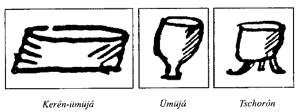 Церемония происходит в летней юрте из бересты. Дверь ориентирована на восток. На /л. 209/ северной стороне юрты стоят кожаные и деревянные сосуды с кумысом. Кожаные сосуды Simír — с горлышком. Перед сосудами стоит множество выдолбленных из березовой древесины посудин для питья, называемых Ümüjá, следующей формы: