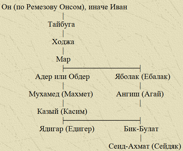 § 56. По летописному протографу, которым пользовались авторы Есиповской и Строгановской летописей, родословная Едигера (Ядигера) представляется в следующем виде: