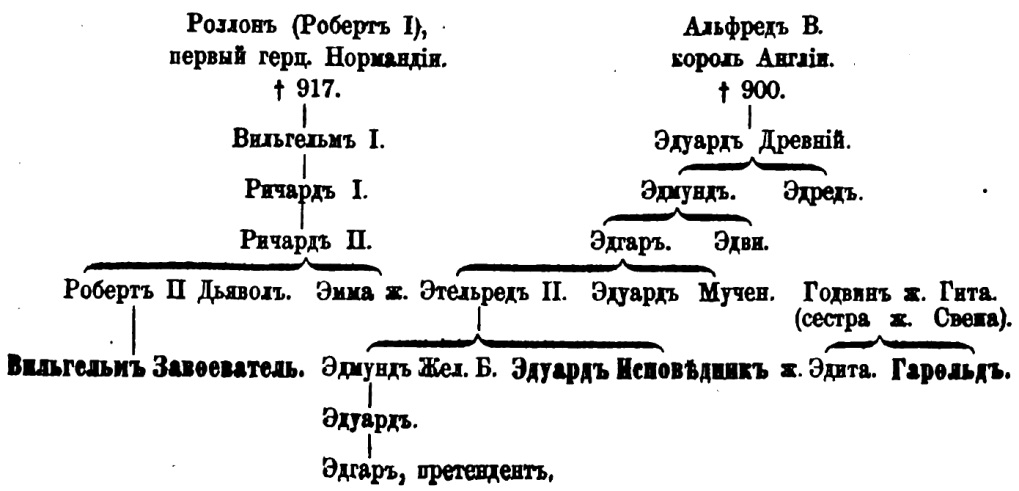 Король Эдуард (Исповедник, 1042-1066) жил счастливо и царствование его было продолжительно; но грустно ему было то, что он не имел детей, ни близкого родственника 1, который бы мог [885] наследовать его королевство и сохранить его. Он размышлял про себя, кто, в случай его смерти, наследует Англию. Думал он о том и часто говорил, что следуете Вильгельму (Нормандскому), его родственнику, лучшему из всей фамилии, наследовать его страну. Роберт, отец герцога, воспитывал его, а сам Вильгельм оказал ему добрую услугу. Всем, что Эдуард ни имел хорошего в жизни, он обязан тому дому. Какое ни оказывал он расположение другим, но так сильно он не любил ни одного человека. Чтобы почтить таких добрых родных, заботами которых он был воспитан, и вследствие могущества Вильгельма, Эдуард желает сделать его наследником своего королевства. В его земле был сенешаль, по имени, Гарольд; он быль благородный вассал; его мужество и доброта доставили ему в королевстве большую власть; это был человек самый сильный в стране. Он был могуществен своими вассалами и друзьями; Англия находилась на его попечении, как то и вменяется в обязанность сенешалю. По отцу он был англо-сакс, а по матери, датчанин. Гита, его мать, была из Дании и считалась весьма знаменитою дамой: сестра ее была матерью короля Канута; мать же Гарольда была женою Годвина, дочь которого вышла за Эдуарда. Гарольд был любимцем своего короля, женатого на его сестре.