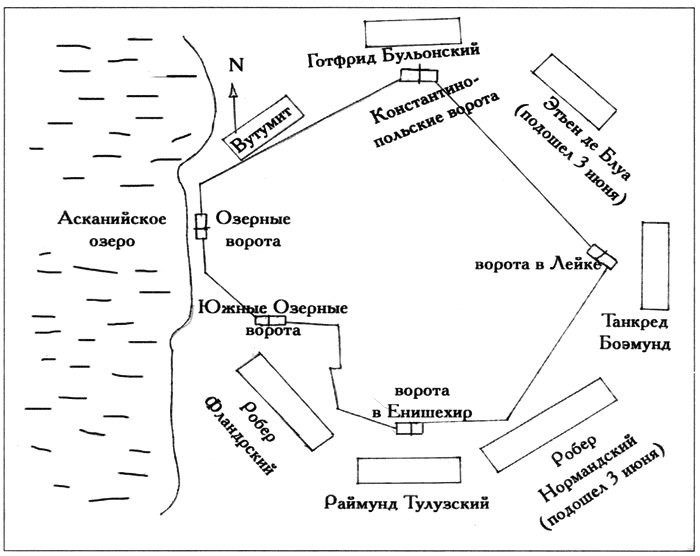 4. В других хрониках расположение Готфрида Бульонского и Боэмунда Таррентского отмечены обратным образом: Готфрид подошёл к Никее первый и осадил её с севера, Боэмунд — с востока.